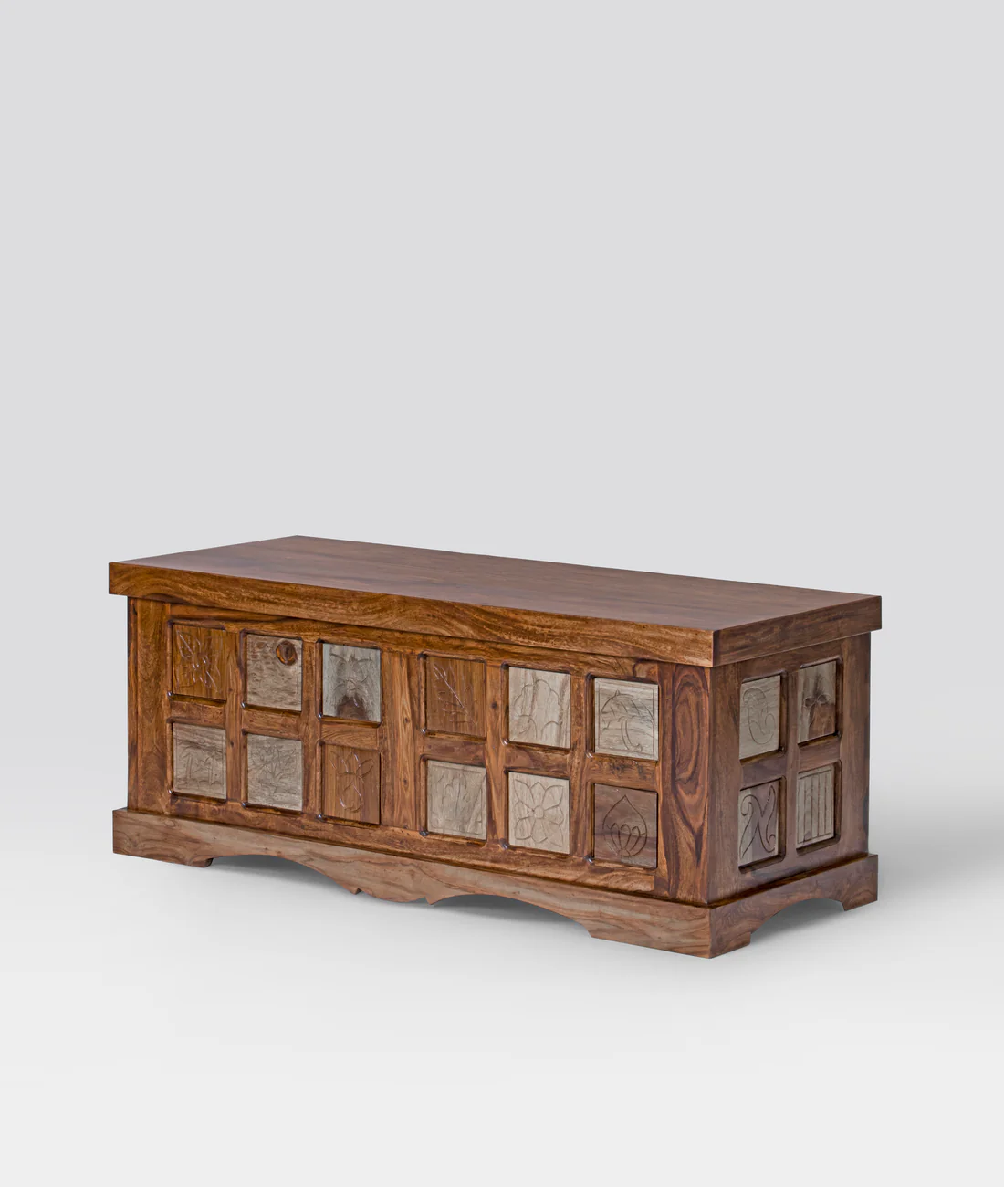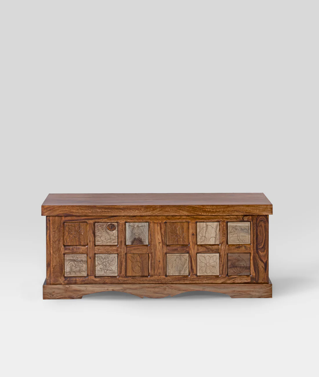 Add a touch of timeless charm to your home with the Designer Solid Wooden Coffee Table Trunk by Comfywood Furniture. Expertly handcrafted from high-quality solid mango wood, each piece is unique, showcasing natural grain patterns that enhance its antique and Mediterranean-inspired appeal.